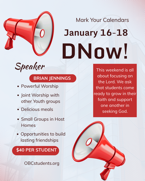 Get ready for one of the most unforgettable weekends of the year! DNOW is a dynamic weekend event where middle and high school students will stay in host homes with their friends and a dedicated group leader. From Friday evening, January16th, through Sunday morning, January 18th, students will engage in: